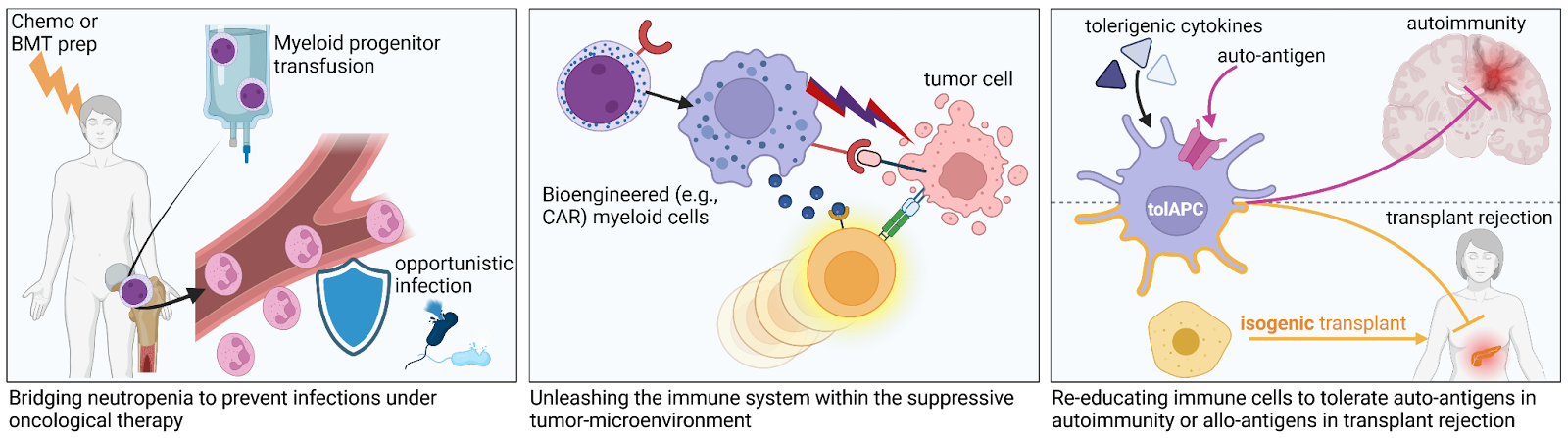 Granulocytes and macrophages are the frontline defenders of the innate immune system. These myeloid cells play a crucial role in not only eliminating pathogens and tumor cells, but also regulating adaptive immune responses. In neonatal sepsis and post-chemotherapy agranulocytosis, the absence of these cells leaves the host highly vulnerable to infections. Beyond replacement to prevent or control neutropenic sepsis, engineered myeloid cells may offer distinct opportunities for cell therapies. For example, the mobility and specific homing capacities of neutrophils to sites of inflammation could be exploited to deliver biocidal agents, or anti-inflammatory healing signals during sepsis, autoimmunity, and organ transplantation. Additionally, myeloid cells can be engineered to express chimeric antigen receptors (CAR), carry chemotherapeutics, or enhance lymphoid tumor killing. However, donation-derived granulocytes and macrophages cannot be produced in sufficient cell numbers for many of these applications, and their short lifespan further complicates logistics and efficacy. In 2023, we have proposed to instead use multipotent granulocyte macrophage progenitors manufactured from hiPSC (iGMP) or from primary CD34+. Such iGMP may not only alleviate the sourcing difficulties of short lived myeloid effector cells, but also extend the duration of effect, greatly simplify cell engineering, and allow an ‘off-the-shelf’ provision, due to superior in vivo expansion capacities and improved cryo-preservation tolerance. By reducing the required cell numbers, bio-engineered, short-term engrafting myeloid progenitors could help bring bioreactor volumes down to a practical scale for making their production more affordable (Buys, Zambidis 2023). We propose that these collective advantages ultimately outweigh the higher initial investment for establishing engineered hiPSC lines or harvesting donor primary CD34+ hematopoietic stem and progenitor cells; particularly when combined with haplotype stem cell banking strategies (see Pluripotent, Naive, and Blastomere-Like Stem Cell Biology and Reprogramming).
