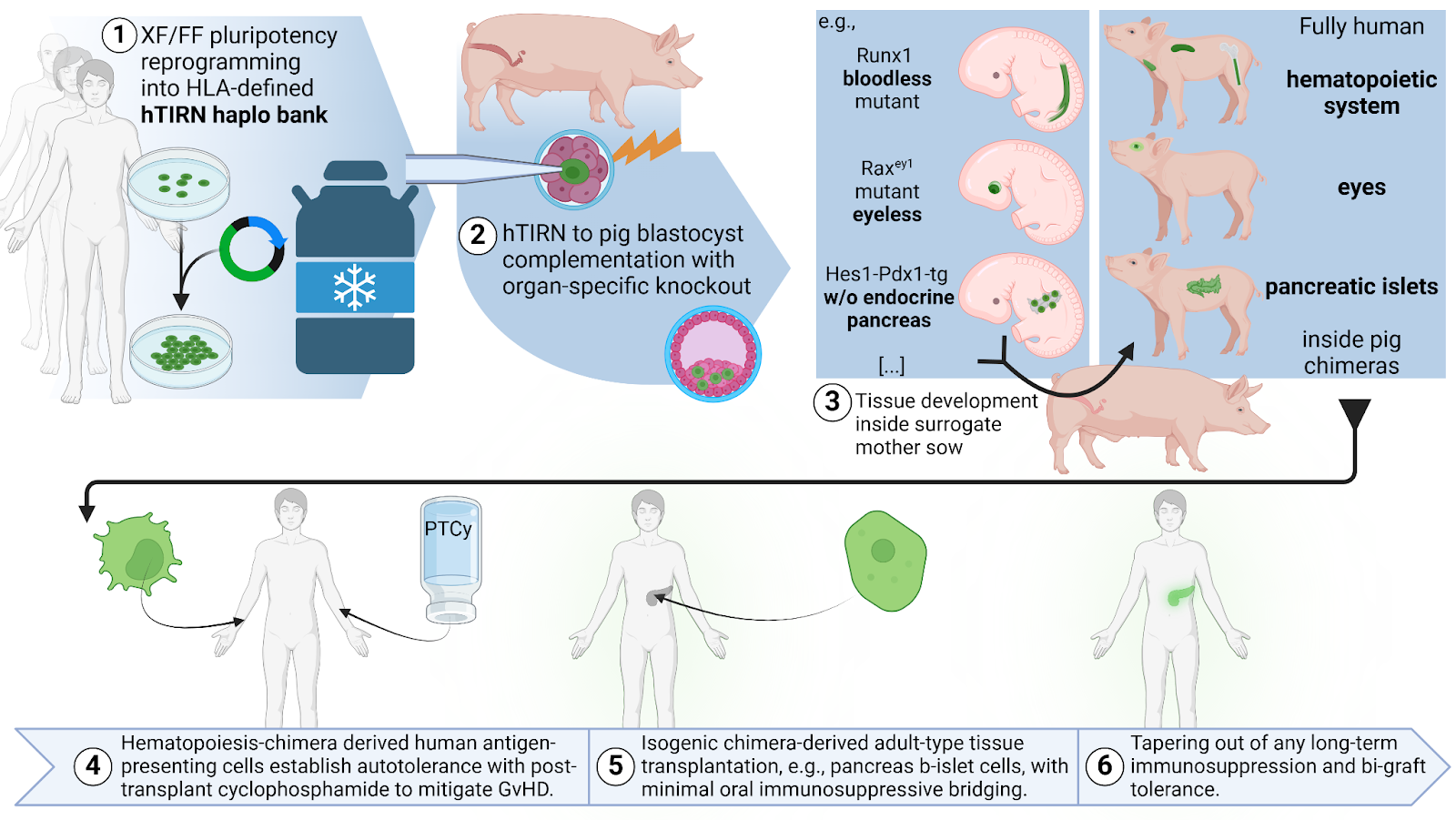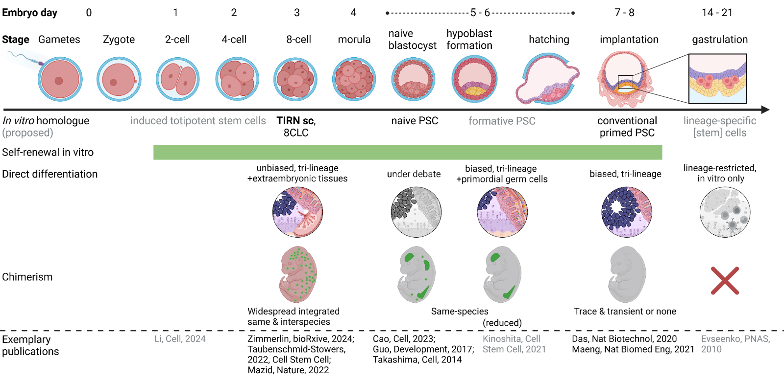 When interrogating the developmental status of our original L3i and improved feeder- & xeno-free TIRN stem cells, we discovered a hybrid transcriptional program of stable naive epiblast-like pluripotency together with features of four-to-eight cell blastomere-like totipotency (also see Proteogenomic regulation of human stem cells with a focus on the PARP-Dux4 regulatory axis). Other than conventional hiPSC, human L3i and improved L4i (manuscript in preparation; patent pending) TIRN cells integrated into mouse embryos with up to 15% chimerism in all tissues on embryonic day 14.5 (Zimmerlin et al, 2024 [bioRxiv]; now accepted at Cell Reports, stay tuned!). We have successfully outgrown human hematopoietic and neural cells from chimeric embryos. To avoid the ethical challenges especially of neural and germline interspecies chimerism, we have decided to not let embryos develop through birth but instead commenced studies to lineage-restrict the human cell contribution while also preserving the excellent chimeric integration and persistence of TIRN-SC (see Stem Cell-based Hematopoietic, Vascular, and Retinal Regeneration).