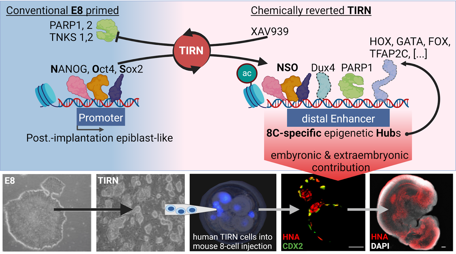 Several studies have employed chemical PARP inhibition to expand pluripotency and improve the chimeric contribution of mouse embryonic stem cells (mESC) into embryos (Gao et al., 2019; Liu et al., 2021; Yang et al., 2017a; Yang et al., 2017b), or to improve functional pluripotency (Park et al., 2020; Park et al., 2018; Thomas et al., 2021; Zimmerlin et al., 2016; Zimmerlin et al., 2017). We have first demonstrated (Zimmerlin et al., 2016) that primed, conventional human pluripotent stem cells (hPSC) can be chemically reverted to a naive epiblast-like pluripotent state with improved differentiation potential via a two-step chemical reprogramming system (‘LIF-5i -> LIF-3i’), that comprised of sequential culture with LIF and five small molecules (i.e., Hedgehog signalling activation, cAMP agonism, GSK3ϕ3 inhibition, MEK inhibition, and nonspecific PARP inhibition (XAV939)). XAV939 is a promiscuous small molecule that inhibits in vitro PARylation activities of not only TNKS1 and TNKS2 (IC50 ∼5.2-94.6 nM), but also PARP1 and PARP2 (IC50 ∼26.9-169 nM) (Huang et al., 2009; Thorsell et al., 2017). Sequential naïve reversion with continuous exposure to XAV939 reprogrammed a large repertoire of >25 conventional lineage-primed hPSC to the TIRN stem cell state (Park et al., 2020; Park et al., 2018; Thomas et al., 2021; Zimmerlin et al., 2016; Zimmerlin et al., 2017, also see Pluripotent, Naive, and Blastomere-Like Stem Cell Biology and Reprogramming). TIRN-SC possess high clonal proliferation, phosphorylated-STAT3 signalling, MEK-ERK/bFGF signalling independence, modulation of ϕ3-catenin expression, and erasure of lineage-primed gene expression (Park et al., 2020; Zimmerlin et al., 2016). The cells were globally inhibited in both TNKS and PARP1 PARylation activities, and TNKS1/2 protein levels were increased while PARP1 protein levels decreased; potentially defining a novel functional PARP protein equilibrium (Zimmerlin et al, 2024 [bioRxiv]). TIRN-SC underwent a global ubiquitinome reprogramming that was driven by hundreds of PARP1 and TNKS1/2 targets; including core factors NANOG and SOX2 and epigenetic modifiers. Unexpectedly, XAV939-mediated TIRN reprogramming activated simultaneous, single-cell co-expressions of ZGA-priming (e.g., TPRXL) and DUX4 gene targets, as well as a panoply of PARP1-regulated lineage-specifying transcriptional factors.